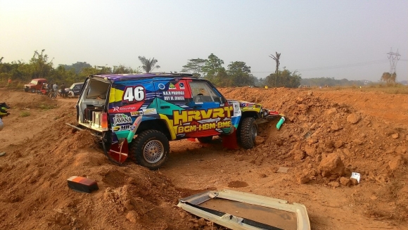 RACING4.NET - 30 Agustus 2015 - HRVRT Speed Offroad Team di hari kedua tampil sangat cepat untuk amankan posisi di Group 4 yang jadi fokus team di putaran 4 Kejurnas Speed Offroad Banten. Mencoba tampil lebih agresif, HR Prayoga HRVRT yang berpasangan dengan Boy M Dinata harus alami nasib sial saat Cherokee yang ditungganginya terbalik dan harus terhenti di awal SS 3 di antara pos marshall 1 dan 2. Komponen safety yang mumpuni di semua kendaraan speed offroad HRVRT tidak menimbulkan cedera apapun di pasangan speed offroader ini.