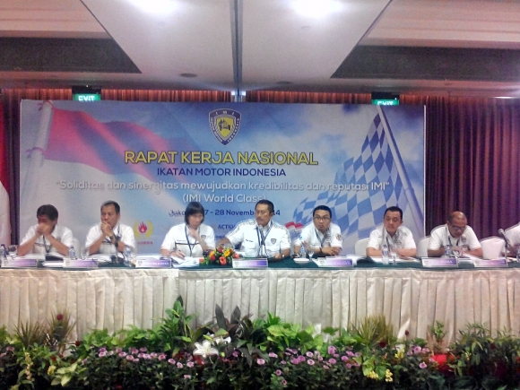 RACING4.NET - 28 Nopember 2014 - Masih dengan agenda rundown acara yang padat sejak digulirkannya Rapat paripurna 1 di hari pertama RAKERNAS IMI kemarin yang akhirnya tuntas pembahasan Motorsport Roda 4 Nasional dengan salah satu agenda besarnya mengembalikan beberapa cabang motorsport ke PROMOTOR NASIONAL. PP IMI dan Rakernas memenuhi janjinya untuk memberlakukan Promotor Nasional di tahun 2015.