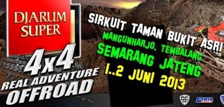 RACING4.NET - KEJUARAAN NASIONAL ADVENTURE OFFROAD PUTARAN-3 1-2 JUNI 2013 SIAP LIBAS SIRKUIT TAMAN BUKIT ASRI, MANGUNHARJO SEMARANG. APAKAH AKAN ADA KEJUTAN LAGI DI PODIUM JUARA? - 1 JUNI 2013 - Sanggupkah Khesena Team dan Galunggung Team Jawa Barat menaklukan rintangan dan lawan-lawannya di semua TS yang menghadang kali ini? Djarum Super 4x4 Real Adventure Offroad Putaran 3 akan dimulai 1 Juni hingga berakhir 2 Juni di Sirkuit Taman Bukit Asri Mangunharjo Semarang Jawa Tengah. Kita nantikan upaya dan gempuran team-team papan atas lainnya yang sempat terpuruk di Putaran Jogjakarta yang lalu seperti Alpindo, Melia, Jhonlin dan lain-lain. Sukses untuk Genta dan simak terus hasil lombanya di racing4 autonews