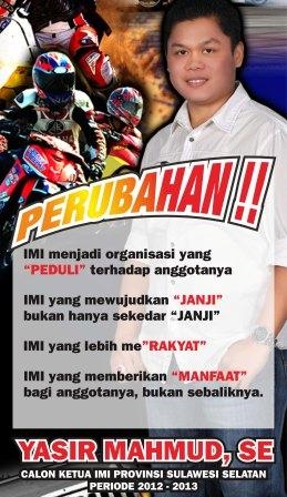 RACING4.NET - YASIR MAHMUD, KANDIDAT KETUA IMI SULSEL AKAN MEMBAWA BANYAK PERUBAHAN DI BIDANG ORGANISASI DAN PEMBINAAN PRESTASI - Satu lagi kandidat kuat Ketua IMI Sulawesi Selatan yang akan bertarung memperoleh dukungan di ajang Musprov/Mukerda IMI Sulsel 24 Februari mendatang, YASIR MAHMUD,SE. Sosok praktisi dan hobbier otomotif Sulawesi Selatan ini melalu lansiran dari team suksesnya menyebutkan telah mendapat dukungan tertulis melewati angka 50% dari total 64 klub yang memiliki Hak Pilih nanti. Suatu bekal kepercayaan yang luar biasa yang harus dibina hingga detik-detik akhir Sesi Pleno 3 Musprov yang akan memggunakan mekanisme pencoblosan nama atau foto calon ketua yang ketat bersaing.